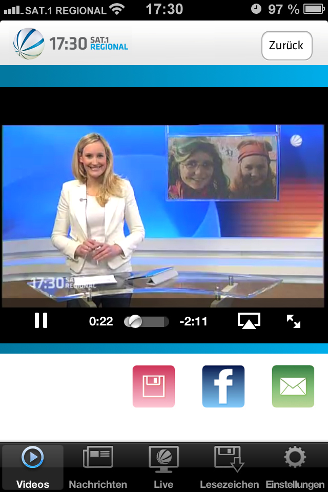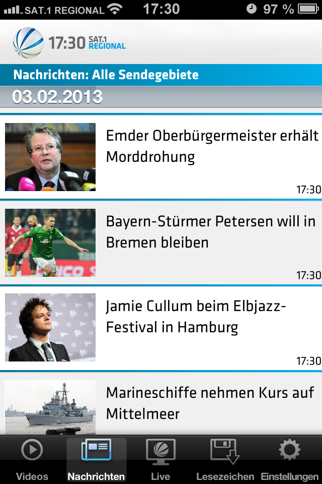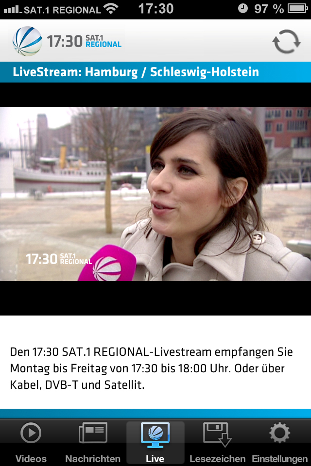 Mit der iPhone-App bietet „17:30 Sat.1 Regional“ seinen Zuschauern – rund um die Uhr und weltweit abrufbar – alle Beiträge und die Sendungen aus Niedersachsen & Bremen sowie aus Hamburg & Schleswig-Holstein im Livestream an.