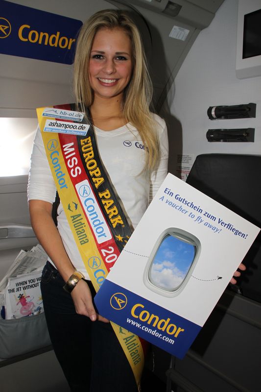 Caroline Noeding wurde von den Passagieren des gestrigen Condor Flugs DE2418 von Frankfurt nach Fuerteventura zur Miss Condor 2013 gewählt. Der Gang der Boeing 757-300 verwandelte sich auf dem Missen-Flug in einen Catwalk, den die Missen zweimal passieren mussten.